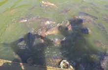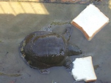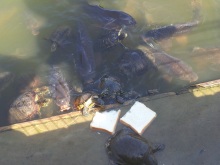 池で亀や鯉にパンをあげた。